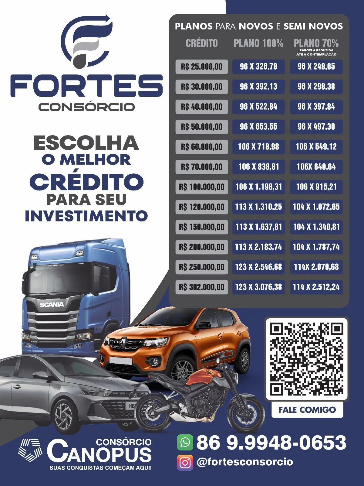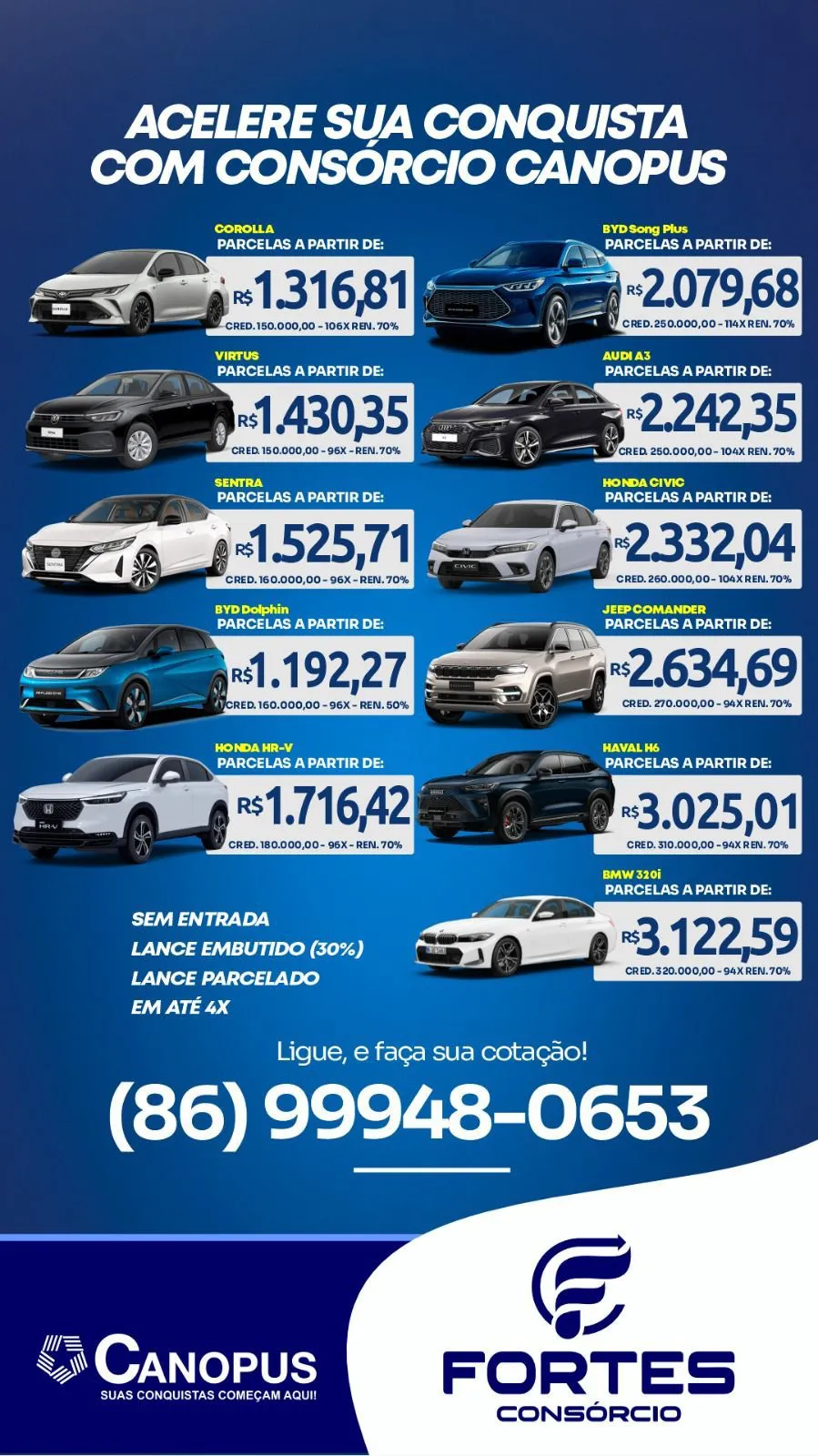 Com o Fortes Consórcio – Emanuel Melo, Agente Master da Consórcio Canopus, você conquista seu veículo novo ou seminovo pagando parcelas que cabem no seu bolso!