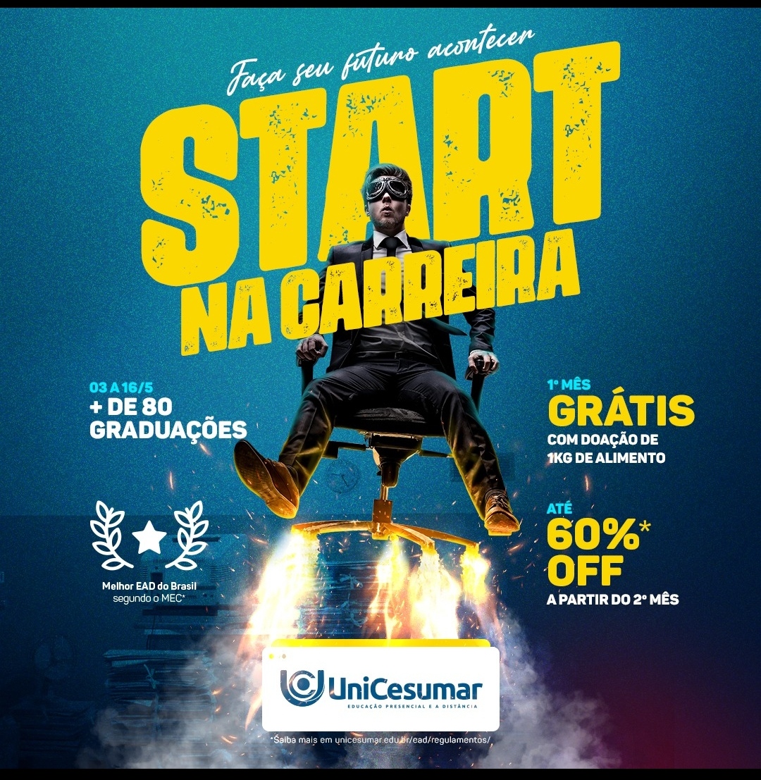 De 3 a 16/maio, você tem garantido até 60% de desconto em mais de 80 graduações e melhor: fazendo a doação de 1kg de alimento, você não paga nada no primeiro mês. Bora aproveitar?