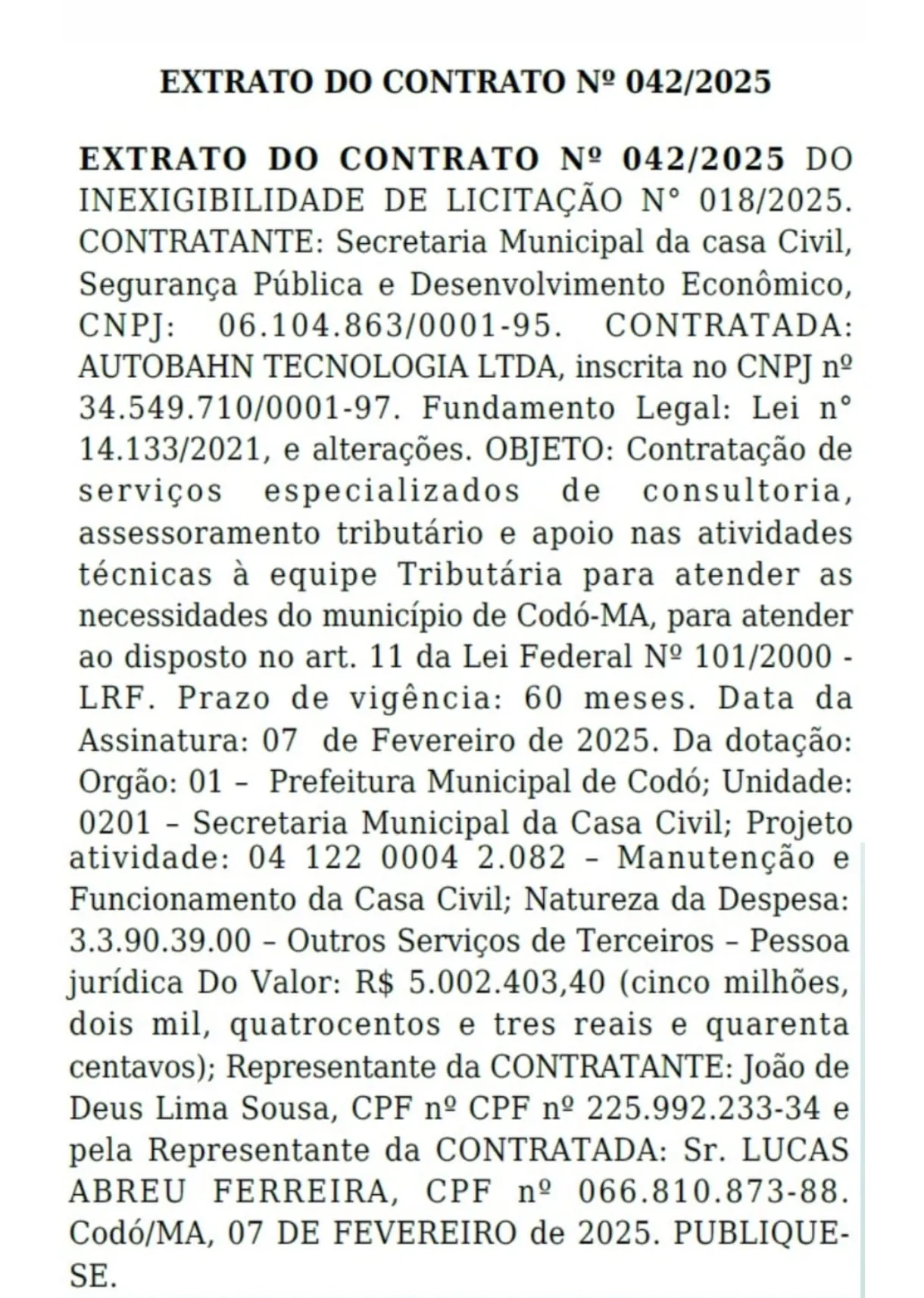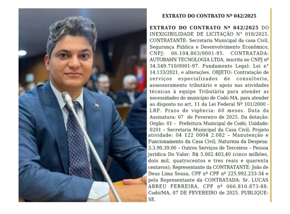 O contrato teria sido firmado entre a Prefeitura de Codó e a empresa Autobahn Tecnologia Ltda, responsável por prestar serviços de consultoria e apoio técnico na área tributária do município. O acordo foi assinado em fevereiro de 2025 e envolve valores considerados altos para esse tipo de serviço.