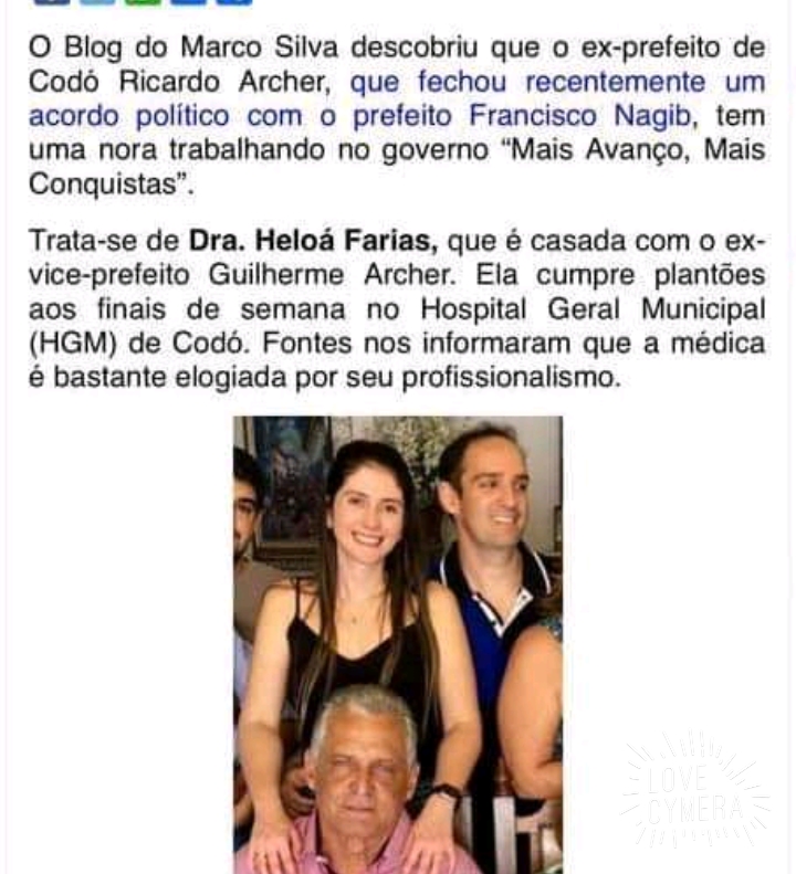 Diante disso, venho a público esclarecer que, a Dra. Heloá Helena Farias Archer, minha esposa, NÃO é funcionária da prefeitura de Codó e NÃO recebe proventos de tal.
