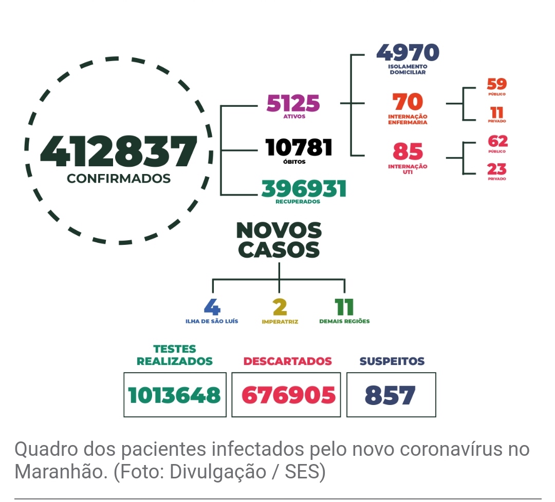 O Maranhão chegou a 412.837 casos e 10.781 mortes por Covid-19 neste domingo (27), segundo dados da Secretaria de Estado da Saúde (SES). Nas últimas 24 horas, foram registrados 17 novos casos e oito mortes pela doença.