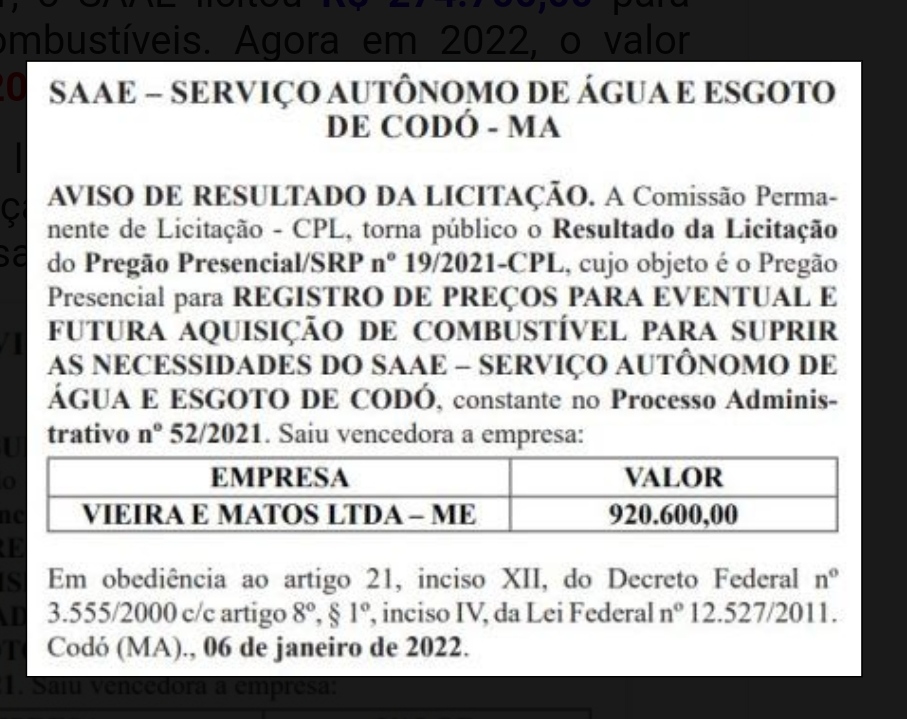 No final de 2021, a autarquia codoense abriu o processo licitatório Pregão Presencial – SRP Nº 19/2021 que tinha como objeto a aquisição de combustível para suprir as suas necessidades em 2022 (reveja).
