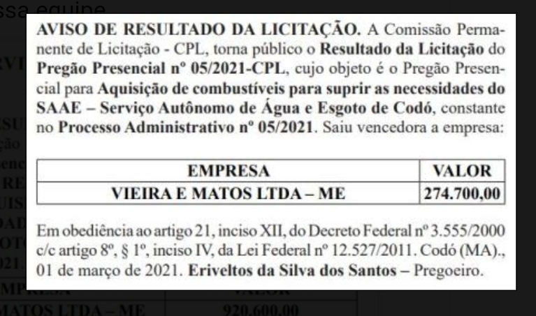Nesta quinta-feira (13/1), foi publicado no Diário Oficial do Maranhão (DOEMA) o resultado da licitação, que teve como vencedora a empresa VIEIRA E MATOS LTDA., nome fantasia POSTO PRÉ-SAL, repetindo o resultado de 2021.