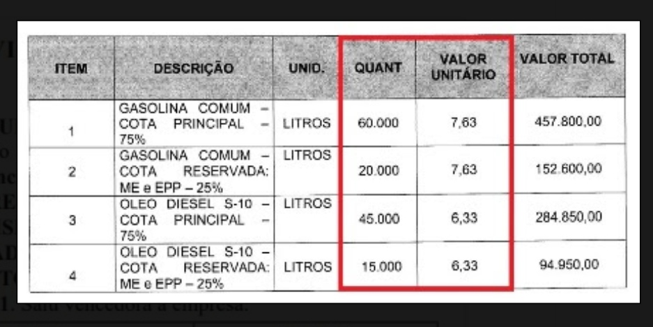 A quantidade de litros (140 mil) e os preços utilizados na planilha orçamentária também