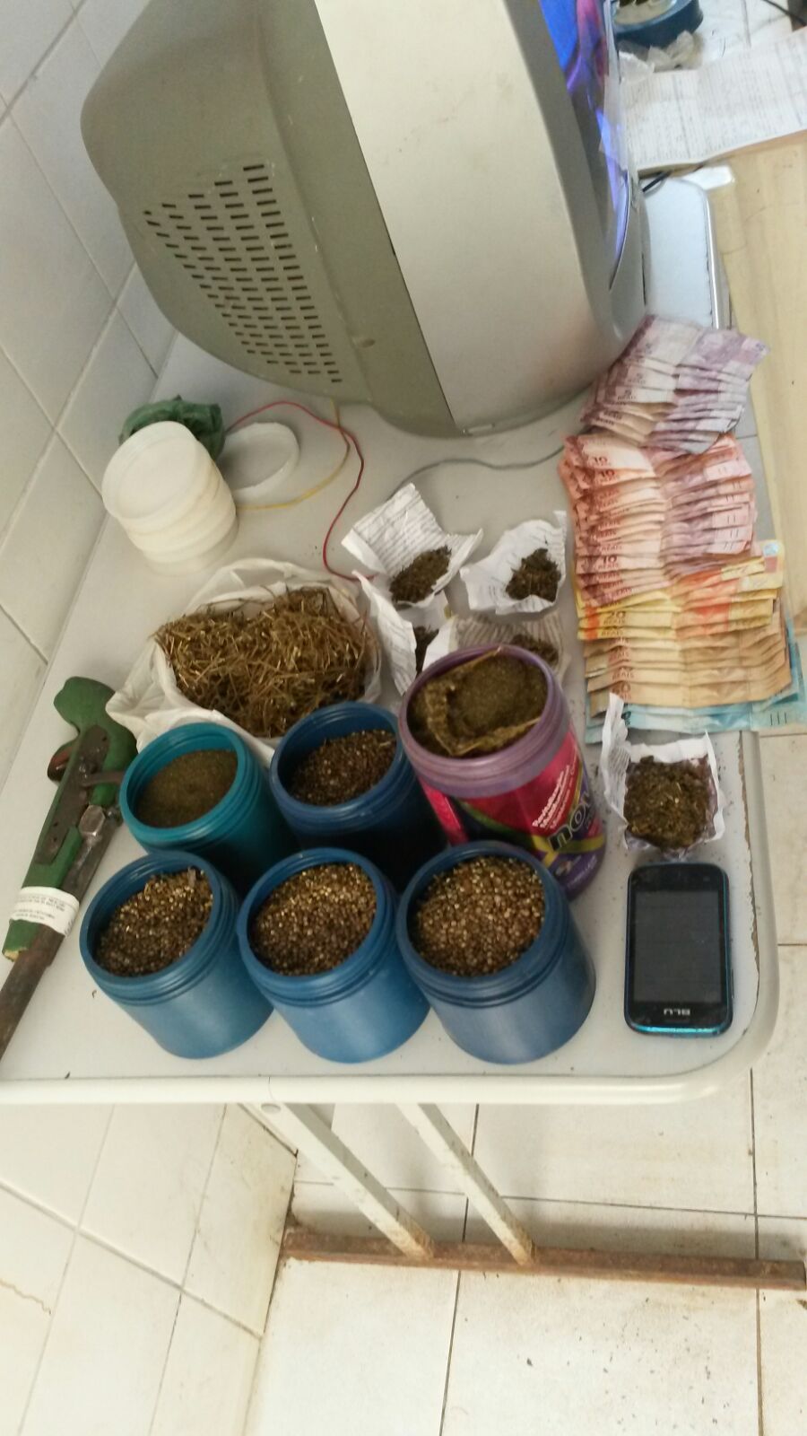 Na residência de Benedito Petronilio foram apreendidos quase mil reais em dinheiro, uma arma de fogo de fabricação artesanal, (garrucha), além de um smartphone e aproximadamente 2 (dois) quilos de maconha.