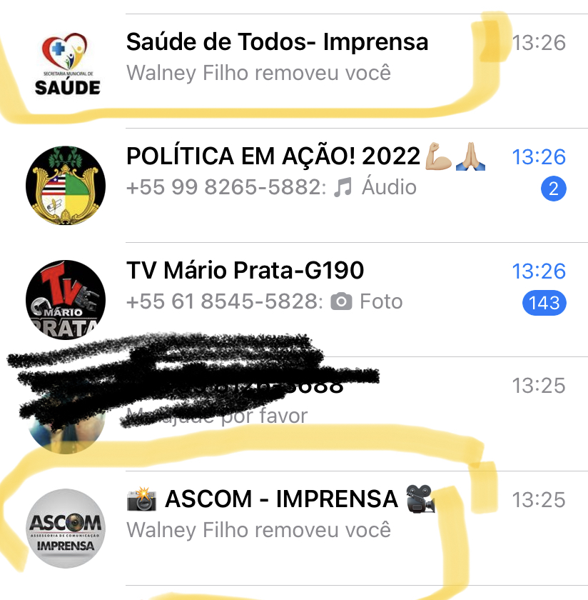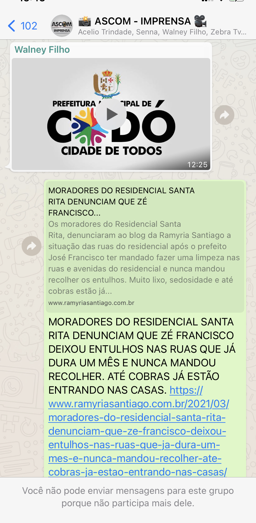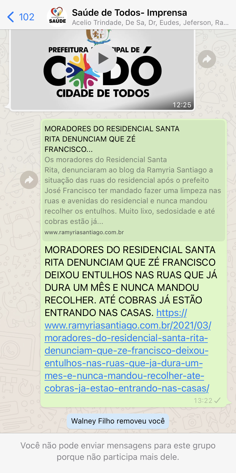 Em uma forma de intimidar o blog da Ramyria Santiago, Walney Filho após ver publicação do blog com denúncias da população contra a atual gestão do prefeito Dr José Francisco Walney excluiu o blog de todos os grupos da imprensa sem falar que esses grupos nem foram criados por ele e sim pelo Médico Dr Mário Braga em uma forma de ajudar o governo unindo e aproximando a imprensa do governo de Zé, coisa que Walney não teve capacidade para criar.